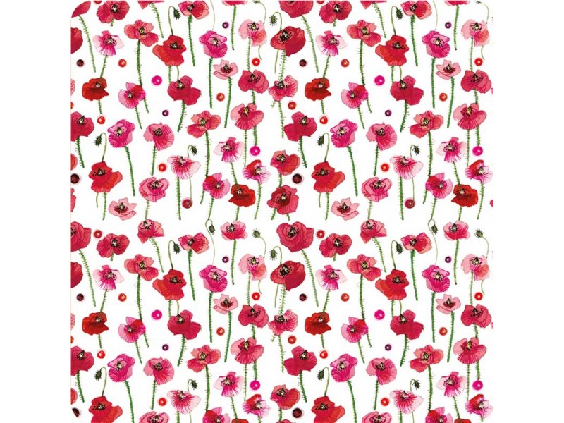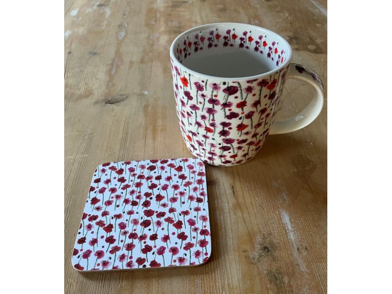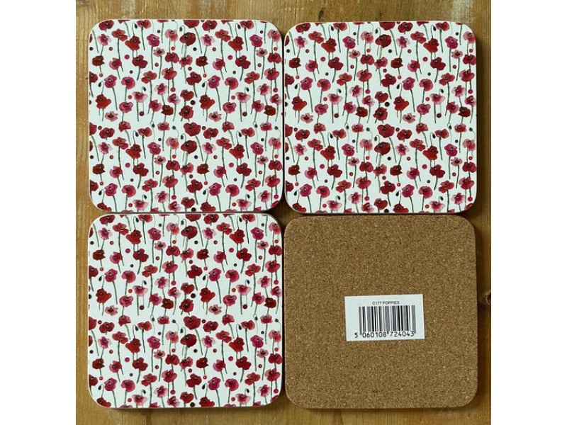 Deze prachtige set van 4 onderzetters toont levendige rode klaprozen in een speels, landelijk ontwerp.
