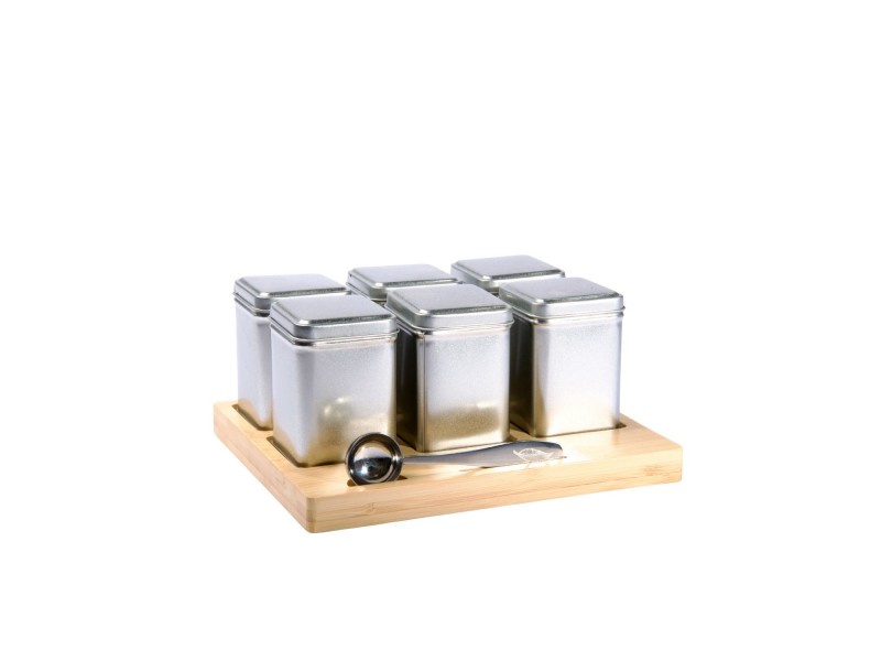 Het plateau is gemaakt van bamboe en is 23 x 19 cm. De dikte van 2 cm zorgt voor stevige uitsparingen voor de 6 blikjes en het thee maatschepje.