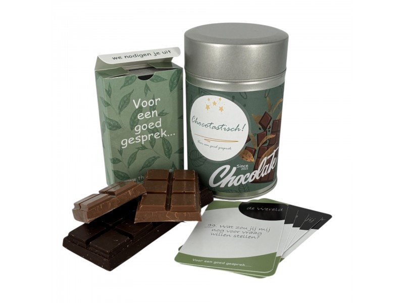 Het blik bevat twee heerlijke repen chocolade – één melk en één puur – van hoogwaardige kwaliteit. Daarnaast zitten er inspirerende gesprekskaartjes bij die zorgen voor leuke en betekenisvolle gesprekken.