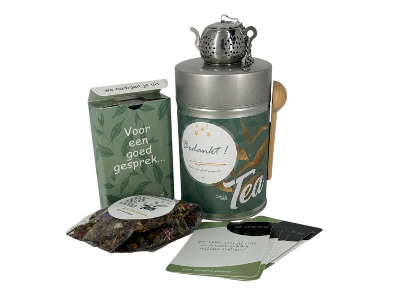 Verras hem/haar dan met een cadeaublik gevuld met heerlijke thee & verschillende gesprekskaartjes.