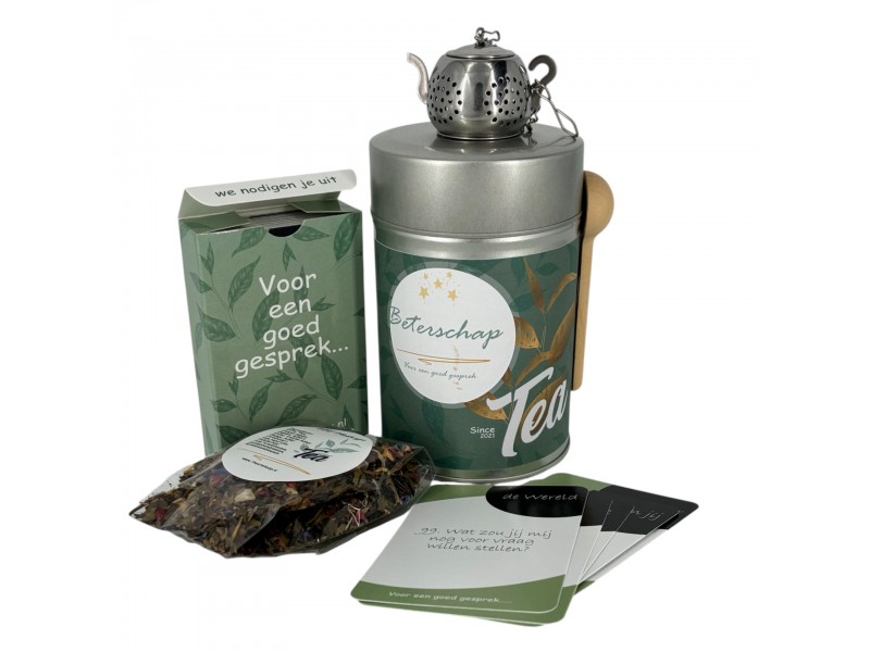 Een klein gebaar met grote impact. Dit sfeervolle theeblik bevat alles voor een ontspannen theemoment: 20 gram heerlijke verse thee naar keuze, een handig thee-ei, houten theelepeltje en een setje gesprekskaartjes voor mooie gesprekken.