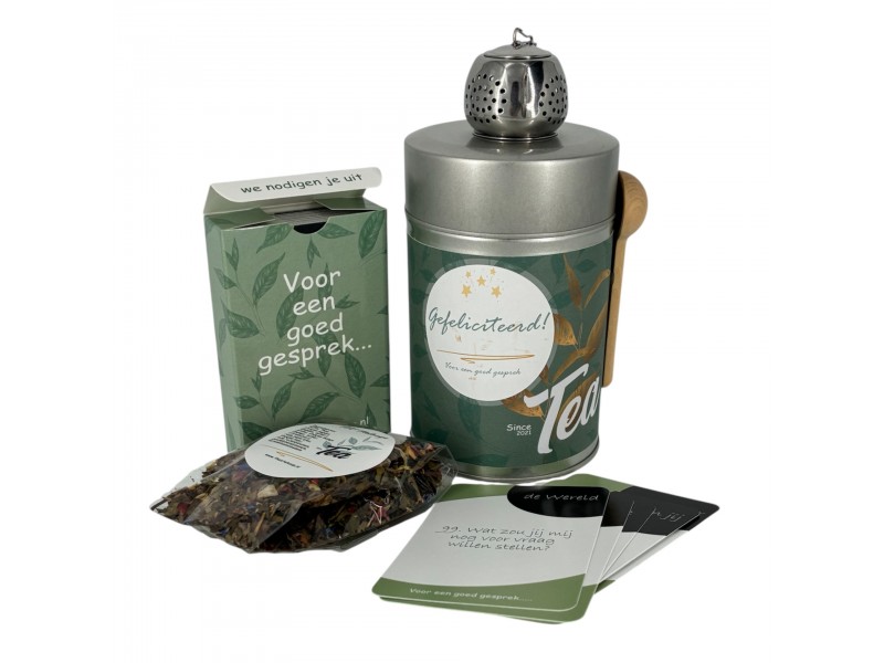 Een klein gebaar met grote impact. Dit sfeervolle theeblik bevat alles voor een ontspannen theemoment: 20 gram heerlijke verse thee naar keuze, een handig thee-ei, houten theelepeltje en een setje gesprekskaartjes voor mooie gesprekken.