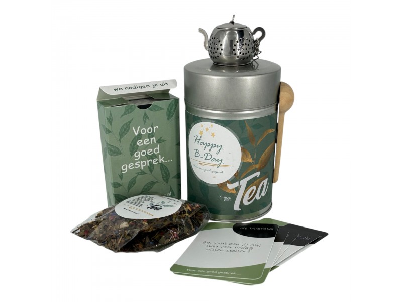 Een klein gebaar met grote impact. Dit sfeervolle theeblik bevat alles voor een ontspannen theemoment: 20 gram heerlijke verse thee naar keuze, een handig thee-ei, houten theelepeltje en een setje gesprekskaartjes voor mooie gesprekken.