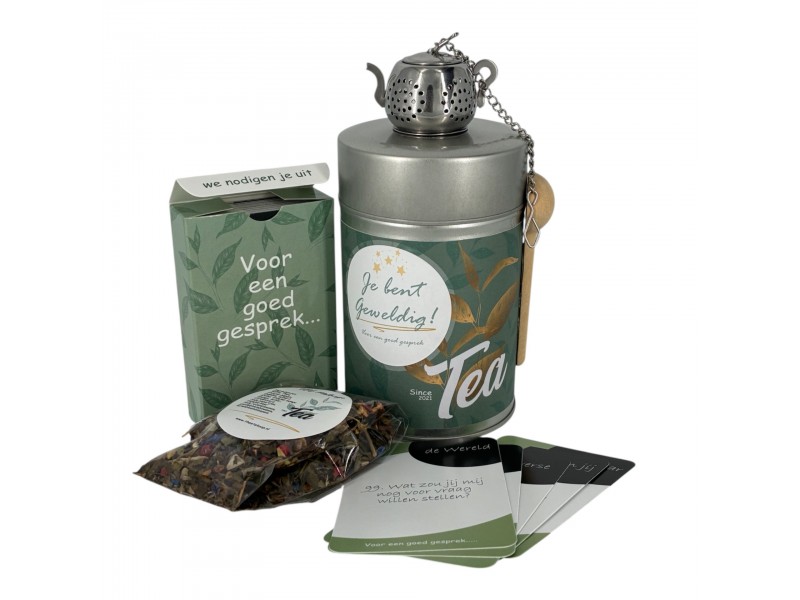Een klein gebaar met grote impact. Dit sfeervolle theeblik bevat alles voor een ontspannen theemoment: 20 gram heerlijke verse thee naar keuze, een handig thee-ei, houten theelepeltje en een setje gesprekskaartjes voor mooie gesprekken.
