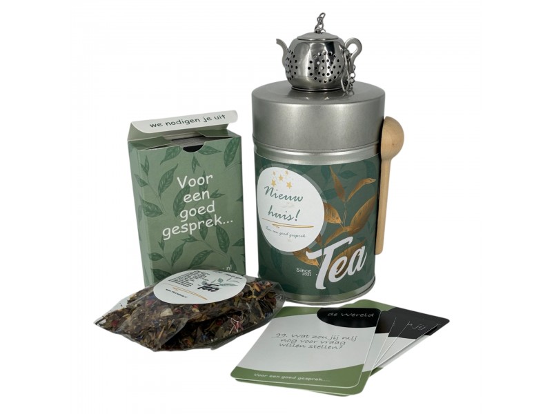 Een klein gebaar met grote impact. Dit sfeervolle theeblik bevat alles voor een ontspannen theemoment: 20 gram heerlijke verse thee naar keuze, een handig thee-ei, houten theelepeltje en een setje gesprekskaartjes voor mooie gesprekken.